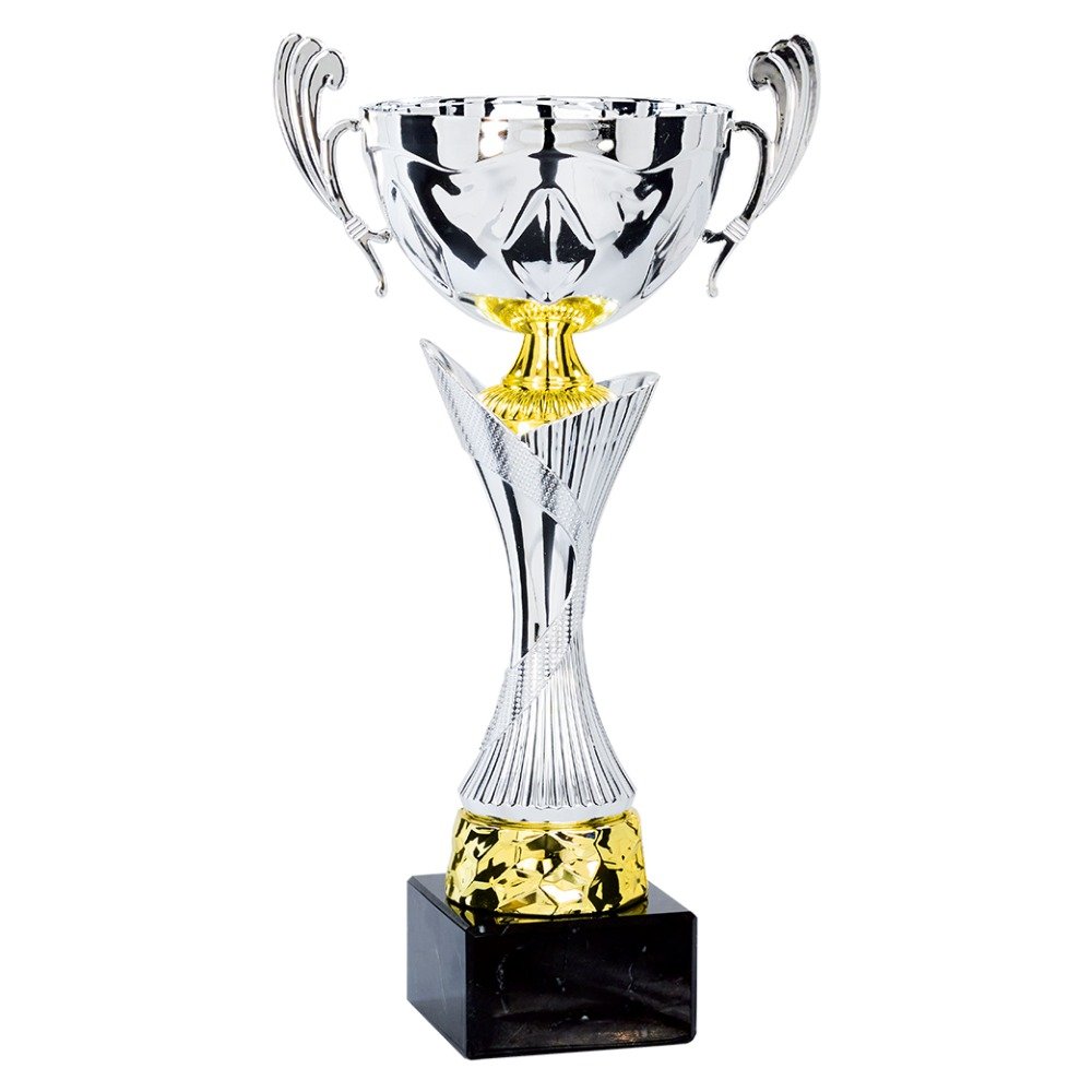 Dieser stilvolle Henkelpokal zeichnet sich durch ein glänzendes Design mit gold- und silberfarbenen Akzenten aus. Er ist eine klassische Wahl für jede Ehrung und verfügt über einen schwarzen Sockel, der Stabilität verleiht. Ein Gravurschild wird lose beigefügt.