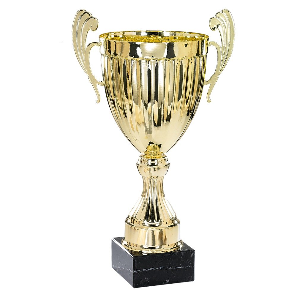 Dieser klassische Henkelpokal präsentiert sich in einer ansprechenden Goldoptik und ist mit einem glänzenden Finish versehen. Er steht auf einem stabilen, rechteckigen Sockel in schwarzer Marmoroptik, der einen eleganten Kontrast bildet. Gravurschild wird lose beigefügt. Bitte wählen Sie Ihre Größe: