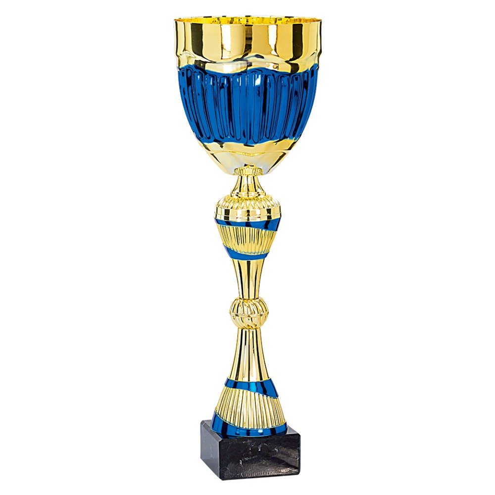 Dieser Pokal präsentiert sich in einer klassischen Kelchform mit einem elegant geschwungenen, goldfarbenen Stiel. Die blaue Tasse und der goldfarbene Fuß sind auf einem schwarzen marmoroptischen Sockel montiert, der für Stabilität sorgt. Die glänzende Oberfläche verleiht dem Pokal eine hochwertige Anmutung und macht ihn zu einer passenden Auszeichnung für verschiedene Anlässe. Gravurschild wird lose beigefügt. Bitte wählen Sie Ihre Größe: