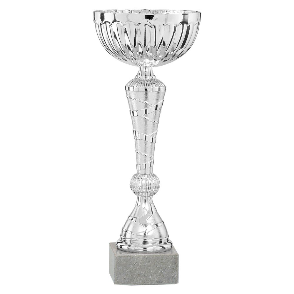Dieser Pokal zeichnet sich durch seine klassische Kelchform mit filigranen Henkeln aus. Der Kelch und die Säule präsentieren sich in einem glänzenden, silberfarbenen Finish, akzentuiert durch ein markantes blaues Muster. Die Basis bildet ein schlichter, silberfarbener Sockel. Dies verleiht dem Pokal eine würdevolle und ansprechende Erscheinung. Gravurschild wird lose beigefügt. Bitte wählen Sie Ihre Größe: