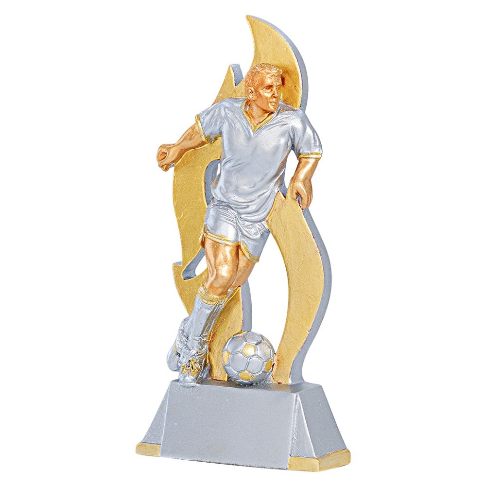 Diese Resinfigur zeigt einen actionreichen Fußballspieler auf einem Sockel. Die Figur ist silberfarben mit goldfarbenen Details und steht auf einem trapezförmigen Sockel.