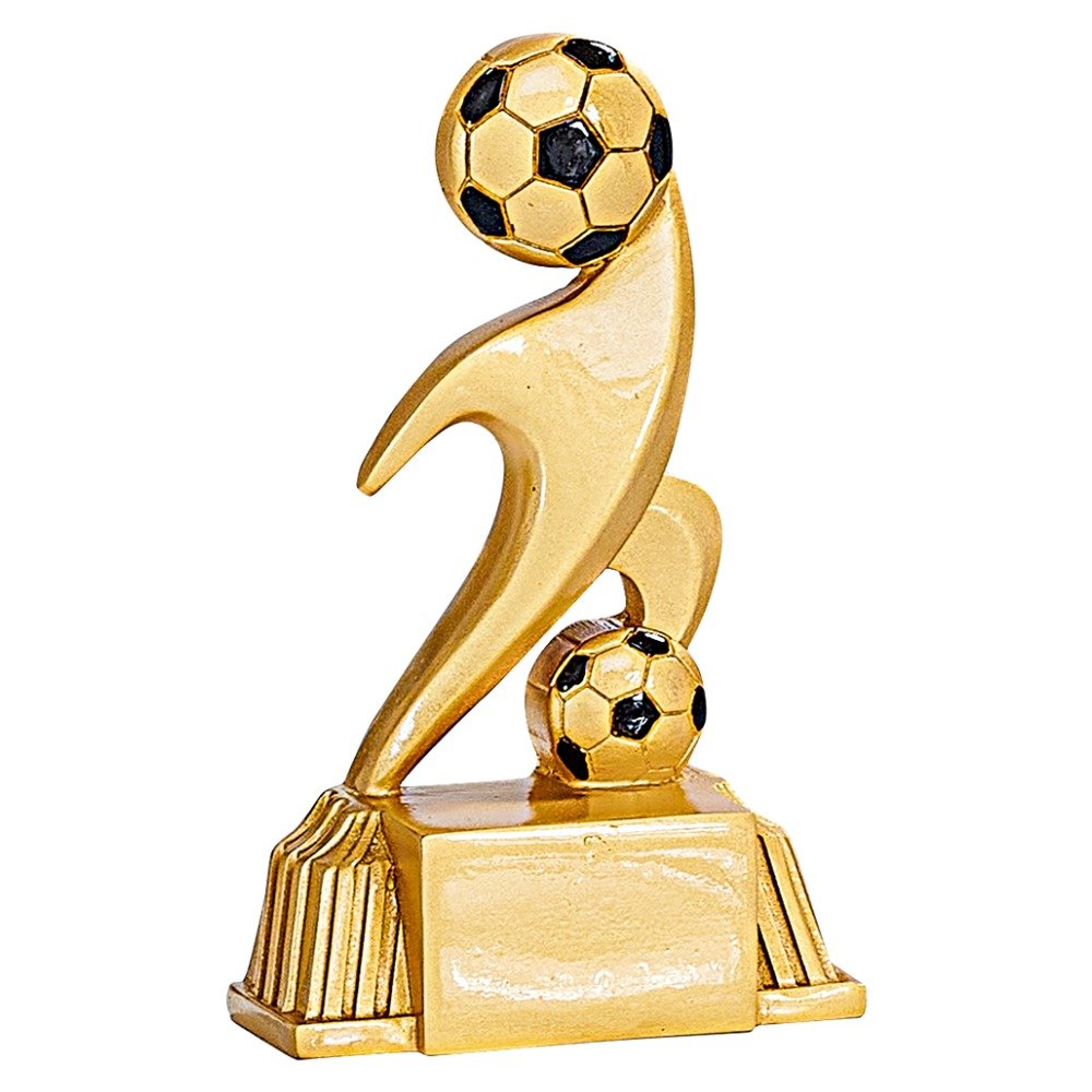 Eine goldfarbene Resinfigur, die einen abstrakten Athleten mit zwei Fußbällen darstellt, thront auf einem mehrstufigen Sockel. Das detailreiche Design ist aus Resin gefertigt und überzeugt durch seine robuste Form. Aufschrift wird beigefügt.